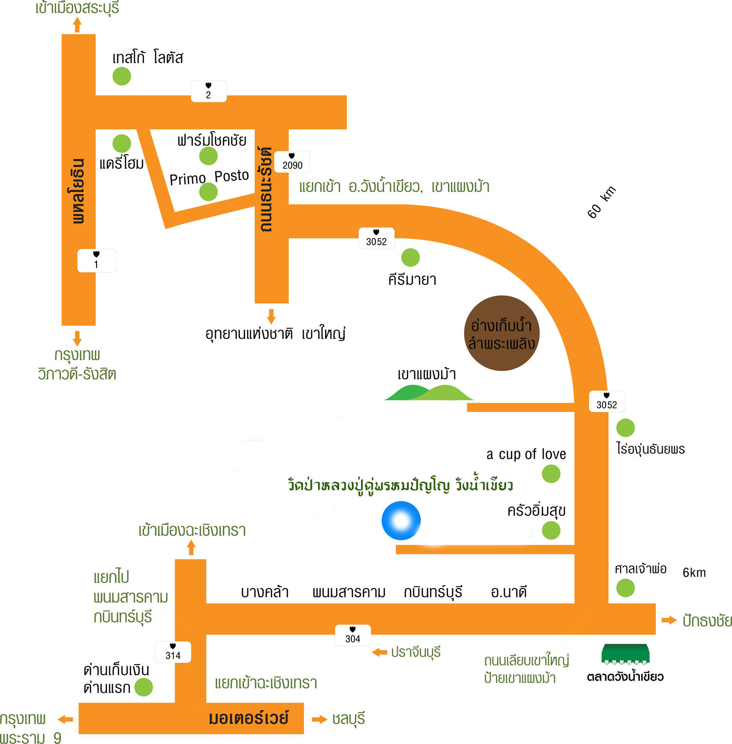- กทม.-สระบุรี-มวกเหล็ก-ปากช่อง-ถนนธนรัชต์-เขาใหญ่-หมูสีโปร่งตาลอง-หนองส้อม-อ่างเก็บน้ำลำพระ เพลิง -เขาแผงม้า